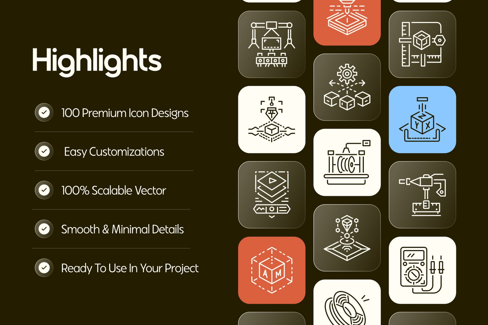 Dive into the world of innovation with this 3D Printing Icon Set Designed for tech enthusiasts and creators, this collection features sleek, modern icons representing 3D printing, modeling, and technology. Whether you are building websites, presentations, or creative projects, these icons are versatile and ready to enhance your work.