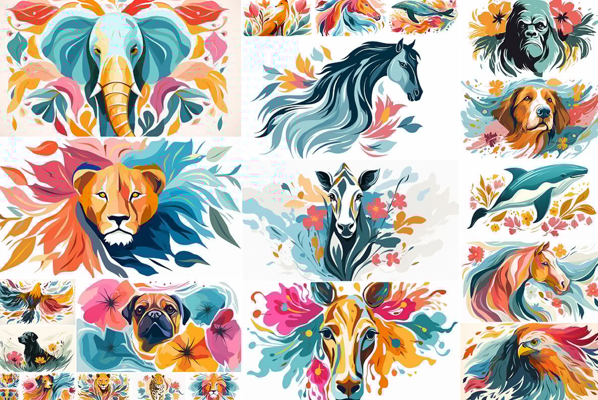 Dive into a vibrant world with this collection of 70 "Animals" illustrations, each one crafted in a colorful floral style that brings animals to life in a truly enchanting way. From majestic lions adorned with delicate blossoms to whimsical rabbits nestled in fields of wildflowers, each illustration blends the beauty of wildlife with the elegance of nature’s blooms. The animals are illustrated with intricate details, vivid colors, and flowing floral patterns that evoke a sense of whimsy and wonder.