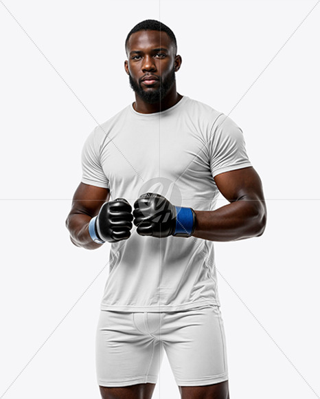 The front view image captures the intense focus and determination of this African American fighter, ready for battle in the MMA ring. His black skin glistens with sweat as he prepares to deliver a knockout punch, wearing gloves that highlight the skill and strength of this martial arts expert. The ufc jersey and shorts fit snugly against his contours, showcasing the athleticism and prowess of this fighter in the world of kickboxing and mixed martial arts. This mockup is perfect for sports apparel brands looking to showcase their gear in action.