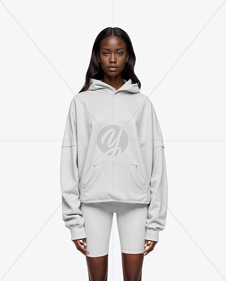 Showcase your brand in style with this photorealistic mockup. The front view mockup highlights the black skin and beauty of the model, making it perfect for apparel and fitness brands targeting diverse audiences. The hooded sweatshirt comes with a kangaroo pocket for added convenience and comfort. The oversize hoodie and shorts add a trendy vibe to the overall look, making it a fashionable choice for any clothing branding campaign. Upgrade your marketing visuals with this high-quality mockup that captures the essence of modern fashion and urban cool.
