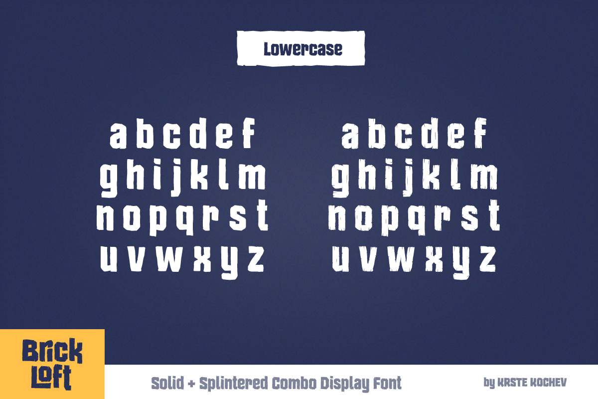 Brick Loft Font is a captivating blend of SOLID and SPLINTERED styles. SOLID brings a rough, distorted look with interlocking letters, while SPLINTERED adds cracks and distortions. This unique font grabs attention in print, packaging, and social media, making it perfect for creating a distinctive and memorable visual impact.