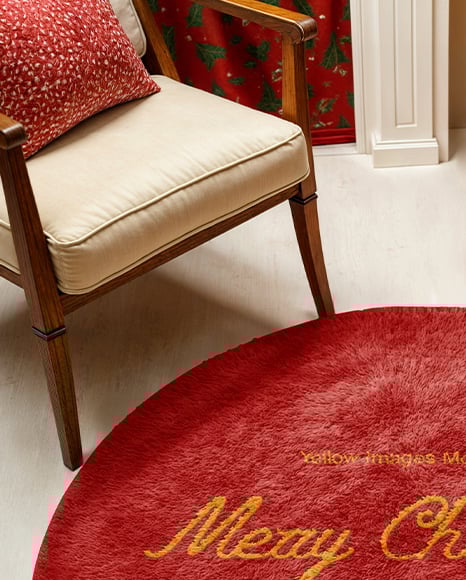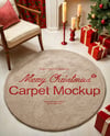 The circular rug is placed near a beautifully decorated Christmas tree, surrounded by gift boxes and holiday decorations. This mockup is perfect for showcasing your brand and branding on a carpet in a festive Christmas mood. The round carpet adds a touch of warmth and comfort to the room, making it ideal for showcasing doormat or fabric designs. Transform any room into a festive winter wonderland with this elegant and captivating mockup.