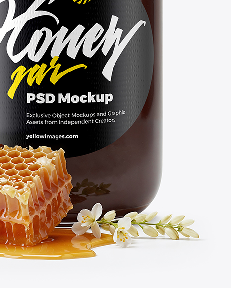 The homemade honey is organic and comes in a beautiful glass jar, perfect for showcasing your brand. The mockup incorporates elements such as honeycomb and flowers to emphasize the organic and natural qualities of the product. This mockup is ideal for presenting a high-quality honey product in a visually appealing way.