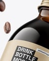 The Cold Brew Coffee Bottle Mockup features a dark amber bottle with a screw cap, perfect for showcasing your cold brew coffee product. This mockup exudes a sense of sophistication and elegance with its gold texture detailing. The soft lighting highlights the rich and strong aroma of coffee beans, promising a delicious and revitalizing beverage. Whether it's a cappuccino, espresso, latte, or macchiato, this mockup is versatile for various coffee creations. The to-go design makes it convenient for customers to enjoy their cold coffee on the move. Elevate your brand with this mockup, perfect for showcasing your bottled coffee product.
