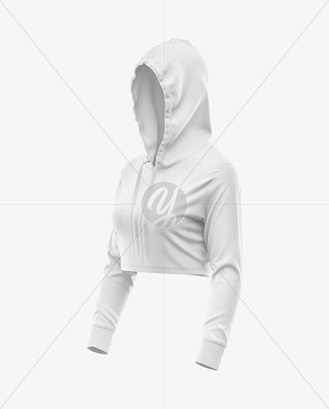 The Women's Cropped Hoodie Mockup is the perfect addition to any adult female's casual wardrobe for cold weather. This top features a cropped cut and long sleeves with a warm fleece material, keeping anyone feeling cozy and comfortable. The half side view showcases a hood with a kangaroo pocket, offering versatile functionality. The mockup displays a pocket on the left side of the garment, adding to the overall stylish design. From outdoor activities to relaxed events, this short hoodie is guaranteed to impress as a fashionable and practical outerwear piece.