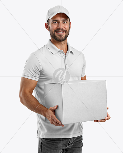 Delivery Man Wearing Polo Shirt and Cap Holding Box Mockup