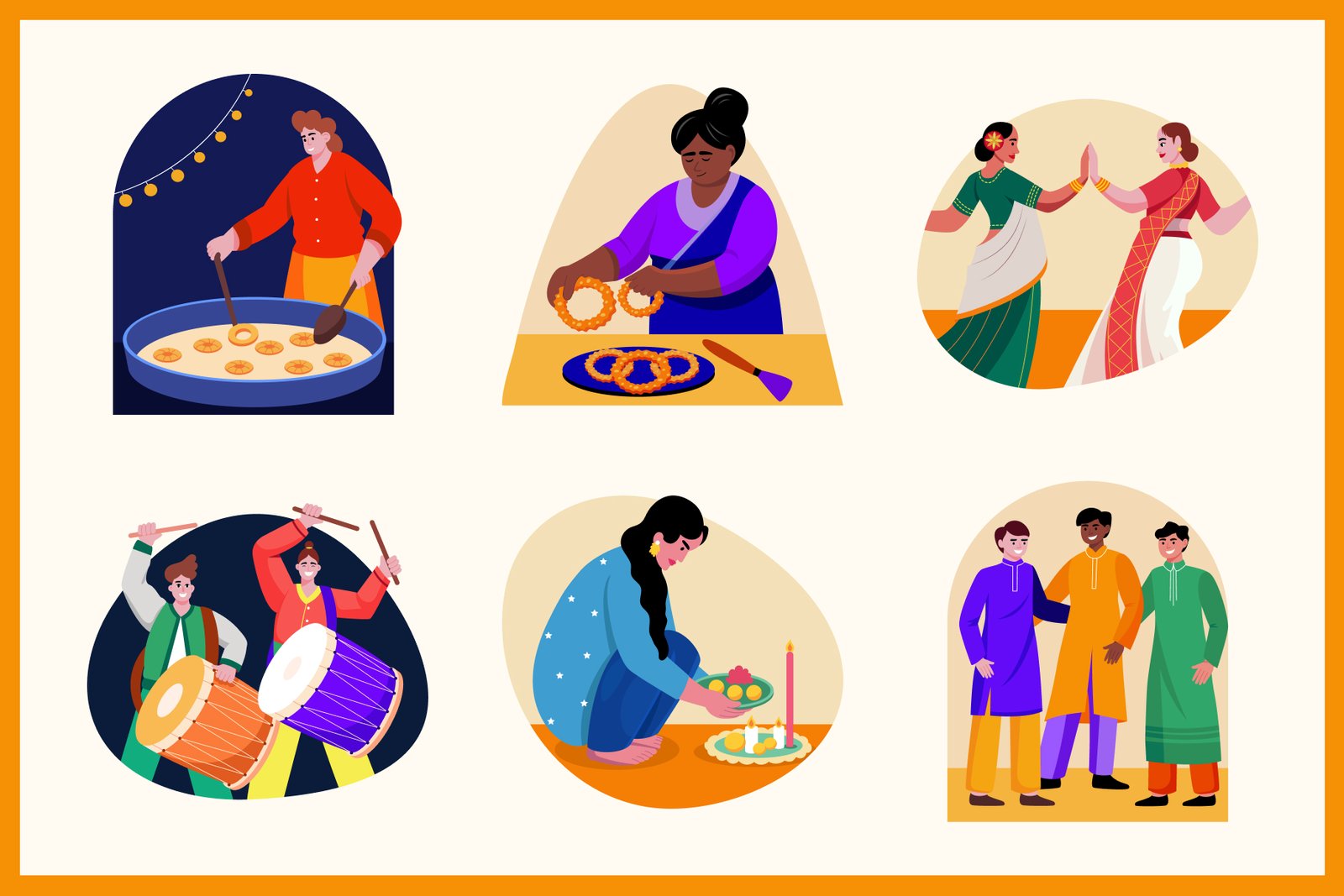 Celebrate the joy, warmth, and vibrant traditions of indian tradition with this beautifully illustrated diwali vector art set. Inspired by the colours of festivities and the charm of Indian culture, this collection brings together everything from glowing lamps and fireworks to sweets and festive decorations. Whether you're creating invites, social posts, or decor-themed artwork, this set is perfect for adding a spark of celebration and cultural richness to your designs. Let your creativity shine as bright as the Diwali lights!