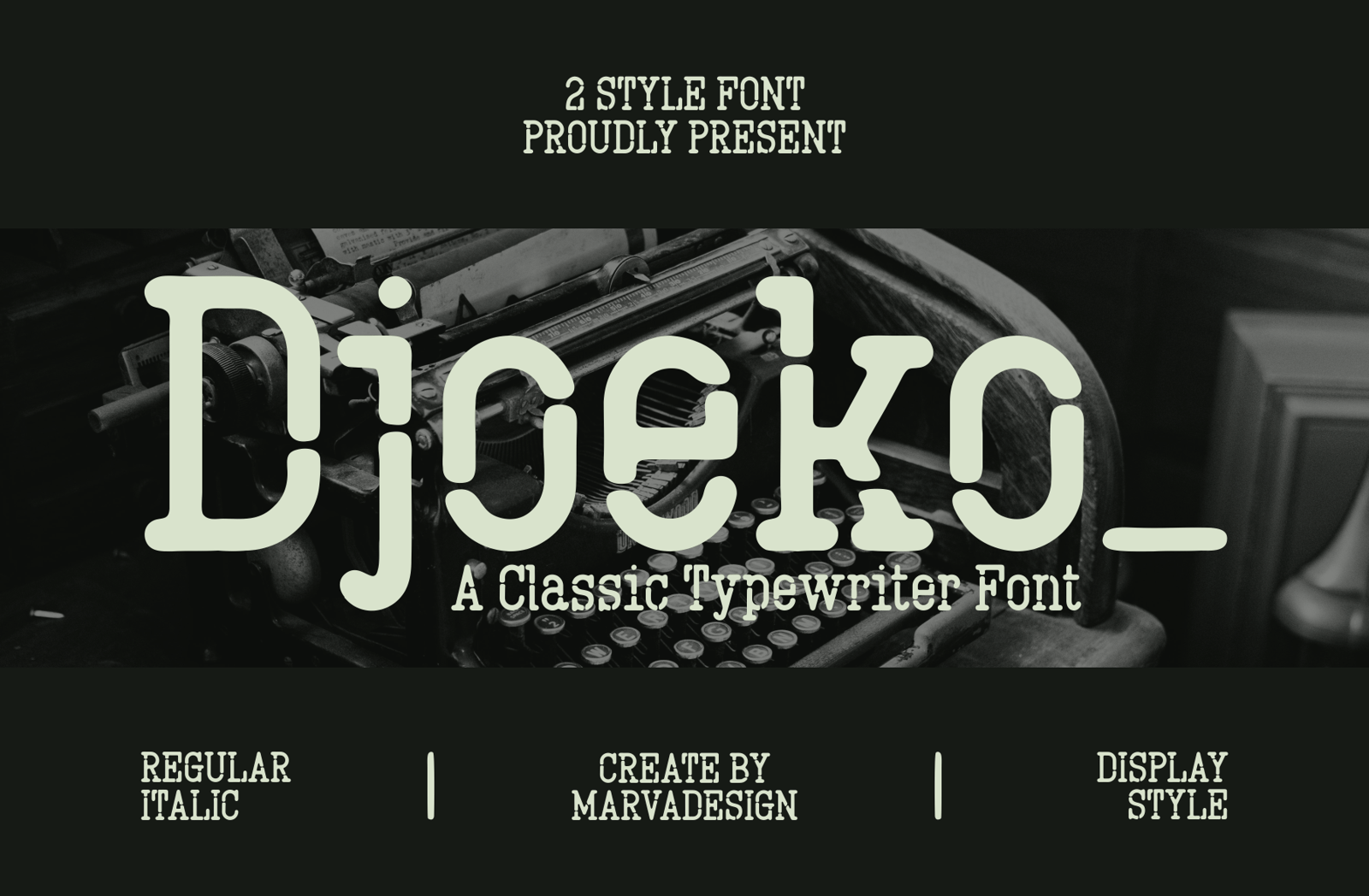 With its bold yet refined curves, Djoeko maintains readability while adding a sense of old-world charm. Ideal for posters, branding, editorial design, and various creative projects, this typeface transports the viewer into the era of mechanical typewriters and vintage printing. Available in Regular and Italic styles, it provides versatility for different design needs.
