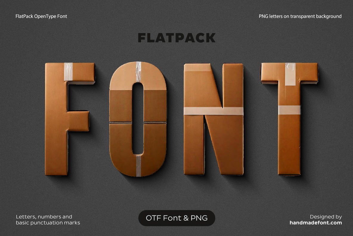 Box-inspired creativity meets industrial design in FlatPack Font, a unique typeface crafted to resemble brown corrugated cardboard. Each letter mirrors the textured, packaging-like surface of a cardboard box, complete with subtle creases and realistic folds. The tactile visual effect evokes the charm of recycled materials, blending sustainability with modern aesthetics. Perfect for delivery-themed designs or eco-conscious branding, this box alphabet brings a distinctive edge to any project. FlatPack Font transforms typography into an ode to packaging innovation, making it a versatile and captivating choice for those seeking a bold, delivery-inspired look rooted in industrial and recyclable material design.