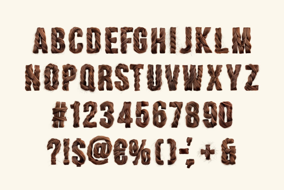 Style meets typography in Hair Font, a unique hair-inspired font where each letter is crafted from flowing, glossy strands. This hair alphabet transforms silky locks into stunning hair lettering, featuring elegant braids, voluminous curls, and sleek straight textures. Every character captures the beauty of hairstyles, from intricate plaits to soft waves, resembling real haircare magic. With rich haircolor tones and lifelike shine, this hair typography embodies the essence of hairgrowth, hairdye, and even playful hints of hairloss. Whether bold or delicate, Hair Font turns the art of haircuts into an expressive, stylish typographic masterpiece.