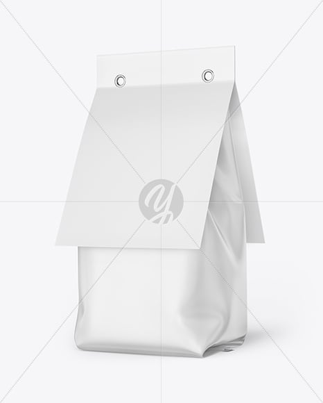 Showcase your work with this high-quality mockup of a Matte Food Bag with paper label. Halfside view. 3/4 view. Matte texture. Includes special layers and smart objects for your amazing artworks. Contains gold layer.