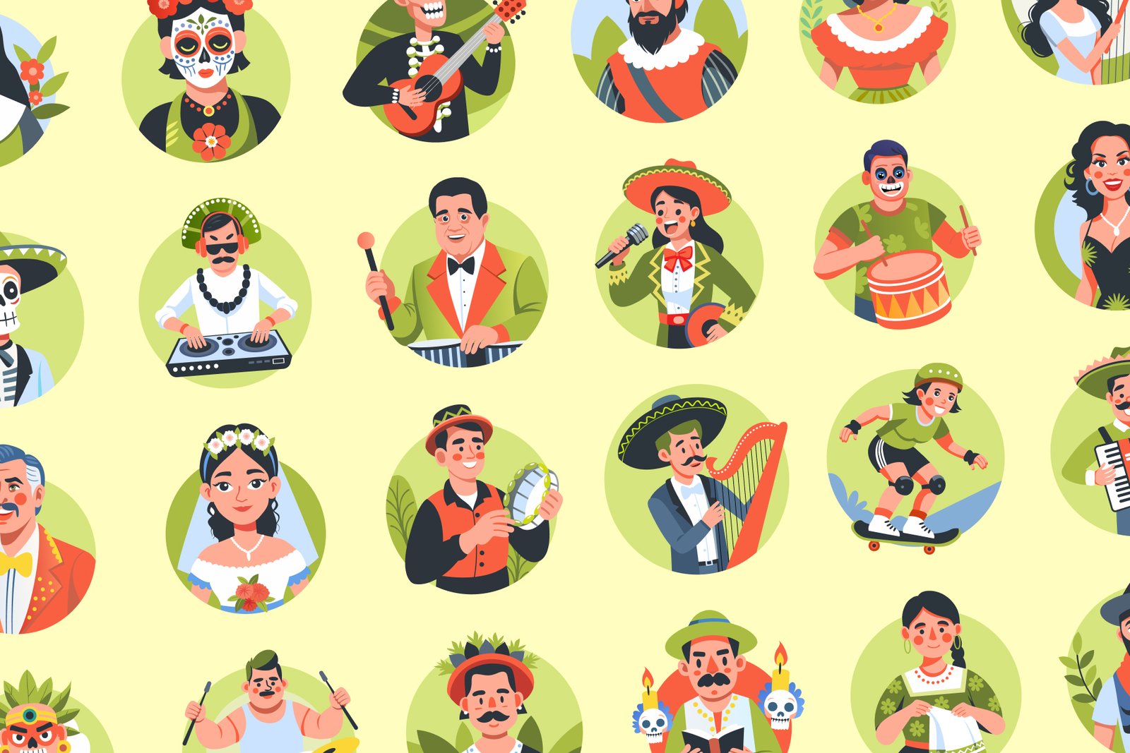 Celebrate the rich traditional culture and tribal heritage with this vibrant collection of illustrated mexican and hispanic characters. This pack features a mix of cartoon, gothic, and iconic Mexican inspired designs. Whether you're working on web designs, posters, or digital products, these versatile characters will elevate your projects.