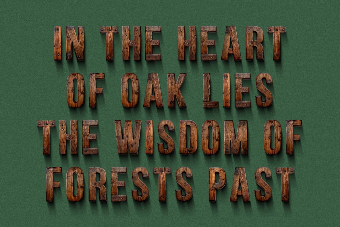 Old wood comes to life in the Oakwood Font, a masterful blend of rustic charm and timeless craftsmanship. Each letter is meticulously carved from aged timber, showcasing the rich grain, natural knots, and organic grooves of hardwood. The oak lettering exudes warmth, with hues ranging from deep brown to golden tones, reflecting the beauty of oak typography. This oak-inspired font captures the raw essence of lumber, offering a polished yet authentically rugged look. Perfect for designs seeking a touch of rustic wood aesthetics, the Oakwood Font brings the strength and elegance of the oak tree to every character.