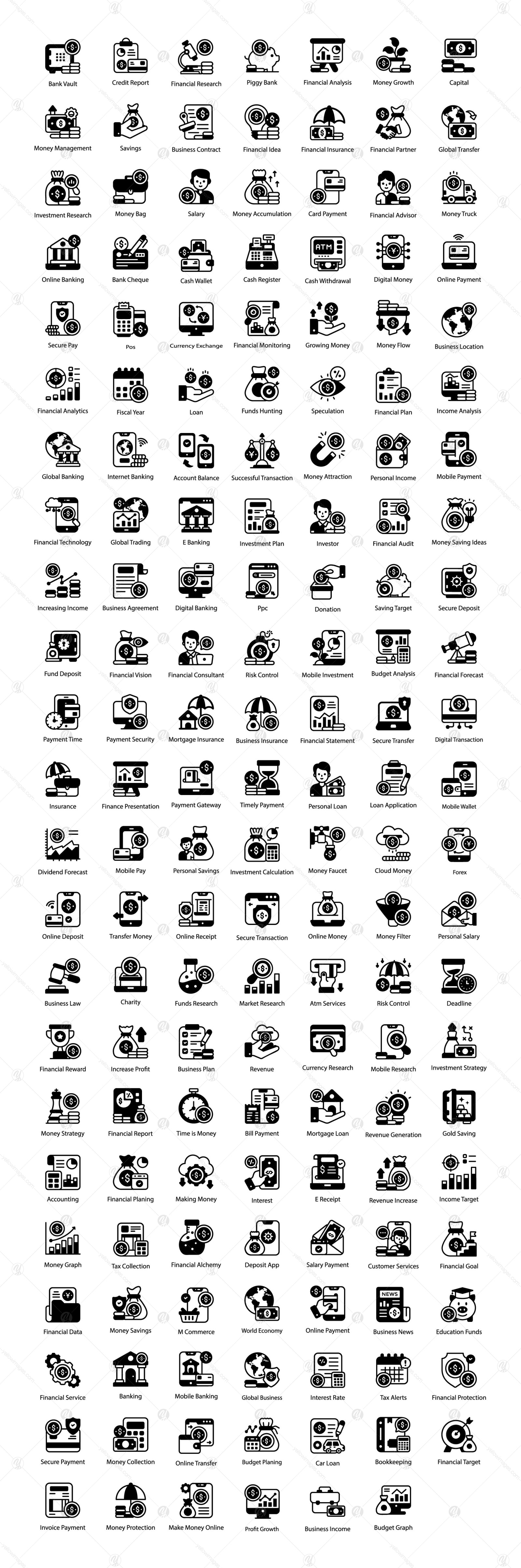 Online banking and finance solid icons set. These icons are uniquely designed to portray the business and financial analytics vectors with captivating visuals. An excellent set to grab and use in related projects.