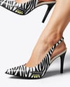 Present your high-heel designs in a modern and elegant setting with this Pair of Slingbacks on Woman's Legs Sitting on Chair Mockup.