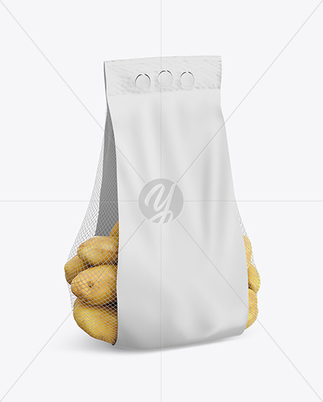 The Potato Bag with Matte Label Mockup is a high-quality, photorealistic design that showcases a pack of fresh vegetables packaged in a plastic net bag. The bag features a matte metallic layer, adding a premium look to the overall design. The golden layer hosts a clear label design that can be customized according to your product packaging needs. This mockup is perfect for showcasing your food products in grocery stores, supermarkets, or any other relevant retail space. Whether you are a food distributor or a retailer, this mockup will make your potato products stand out on the shelves.
