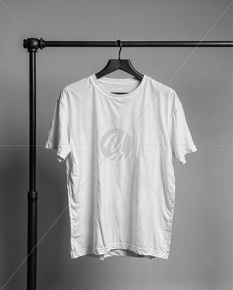 A plain t-shirt hanging on a black metal hanger. The t-shirt is displayed against a gray background.