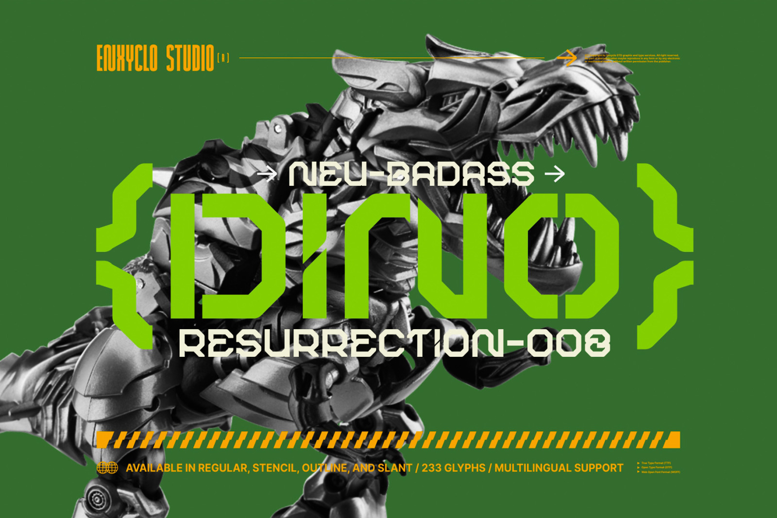 - 8 Styles: Regular, Slant, Outline, Outline Slant, Stencil, Stencil Slant, Stencil Outline, Stencil Outline Slant