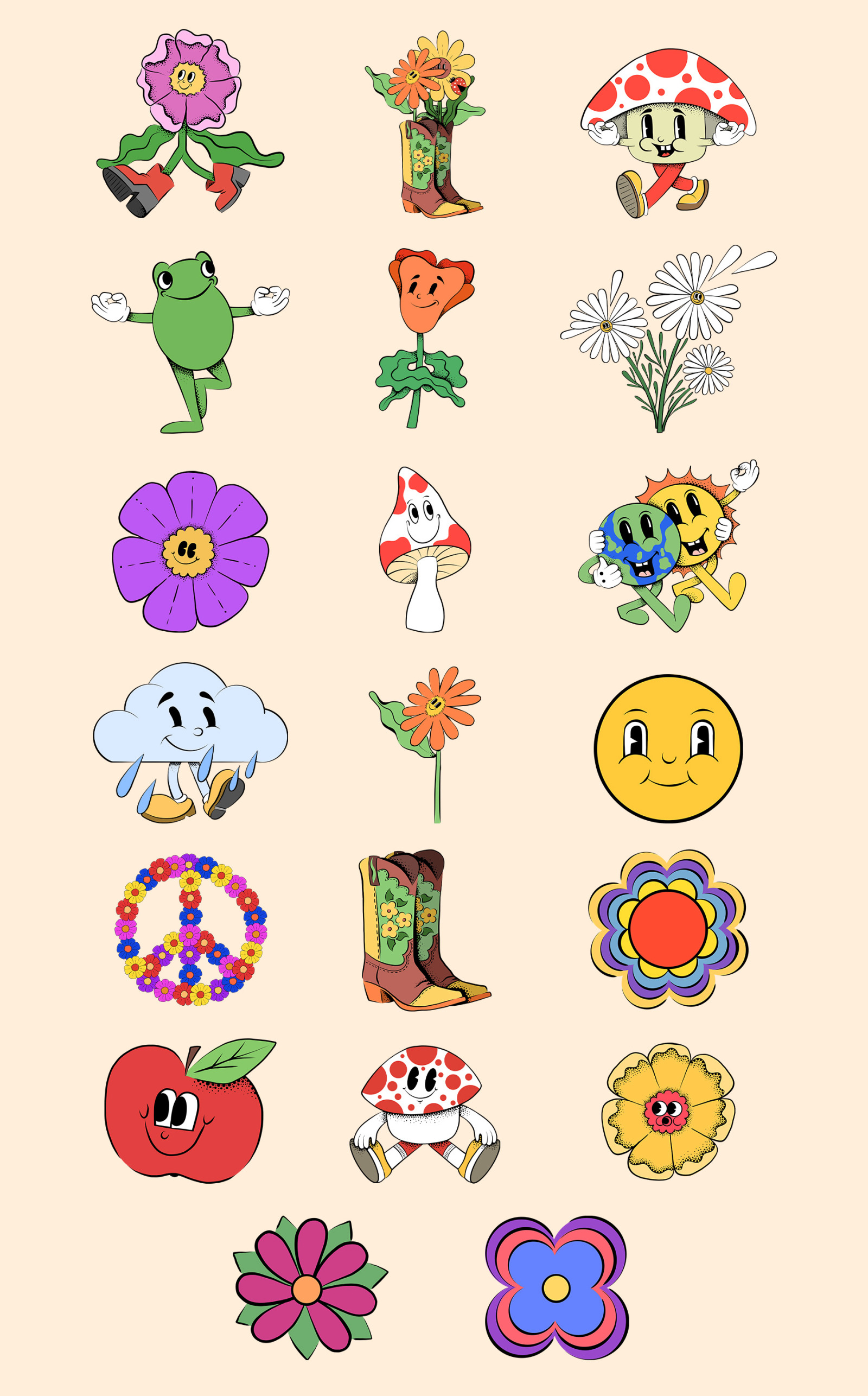 Summer Vibes - A vintage retro character collection - flowers, animals, celestial, mushrooms and other. Funny Characters in style of the 70's, Hippie and boho elements. Perfect for posters or a retro logo design, print for t-shirt, for creating greeting cards or invitations, wall art and more other.