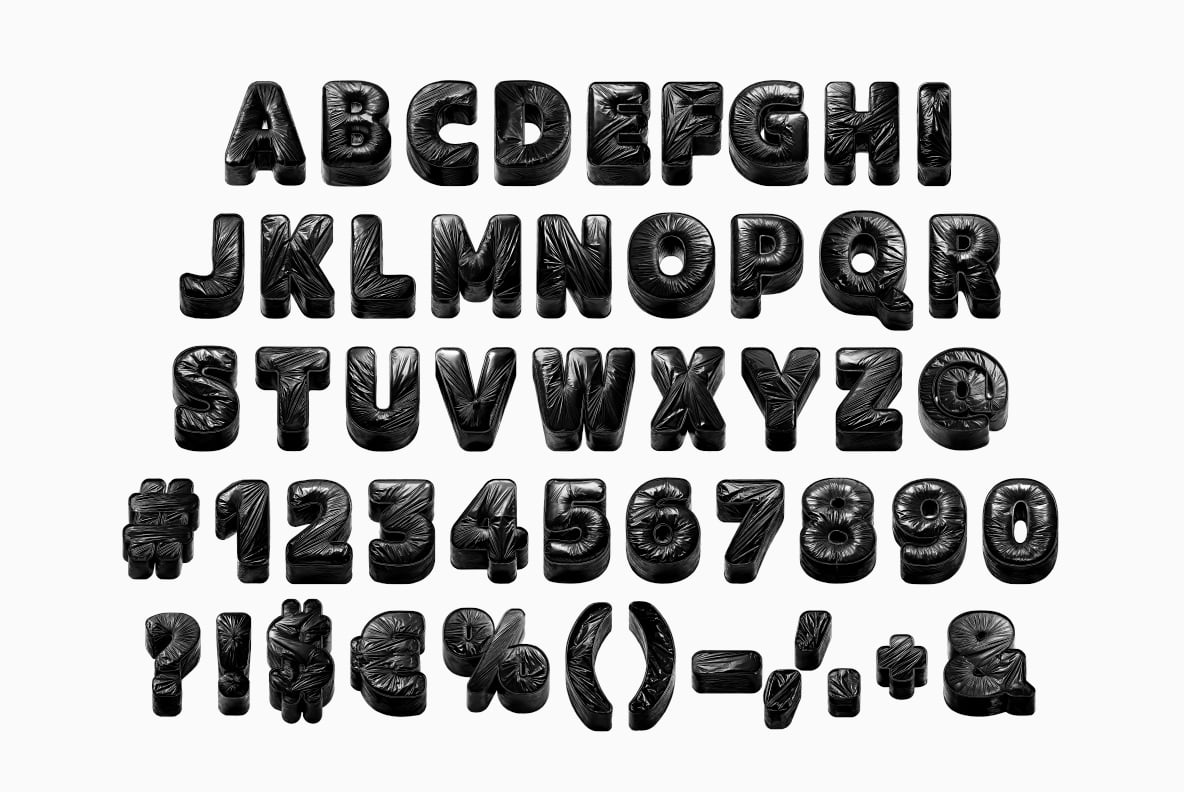 Meet TrashType Font: the dumpster-diving diva of typography. Each letter looks like it’s been stuffed with bad decisions, old pizza, and pure design gold, all wrapped in shiny black trash bags. Soft yet chunky, wrinkled yet fabulous, it’s the kind of font that says, “I’m garbage, but make it fashion.” Hyper-realistic creases and glossy textures give it that fresh-from-the-curb appeal. It’s sculptural. It’s absurd. It’s weirdly beautiful. Perfect for punk zines, eco-posters, or any project that dares to get dirty. TrashType doesn’t whisper elegance—it yells, “This is trash, baby, and it belongs in a museum!”