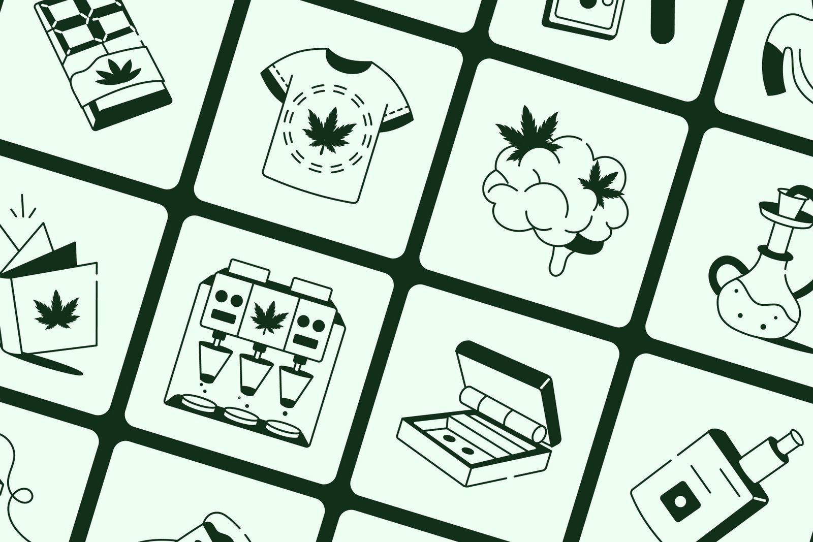 - Includes weed leaves, buds, smoke, joints, and pipes