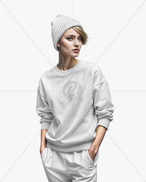 This realistic mockup features a woman wearing a comfortable sweatshirt and stylish beanie hat. The casual apparel mockup is perfect for showcasing designs for women's clothing brands. The sweatshirt mockup highlights the cozy and versatile nature of the garment, while the beanie hat mockup adds a trendy touch to the overall look. Ideal for showcasing designs for fall and winter collections, this mockup is a great way to display your branding or artwork in a professional and eye-catching manner. Perfect for online stores, social media, or marketing materials, this woman wearing sweatshirt and beanie mockup is sure to make your designs stand out.