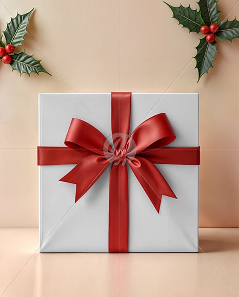A wrapped gift box with a red ribbon and bow, placed on a surface. The background features holly leaves and berries, adding a festive touch to the scene.
